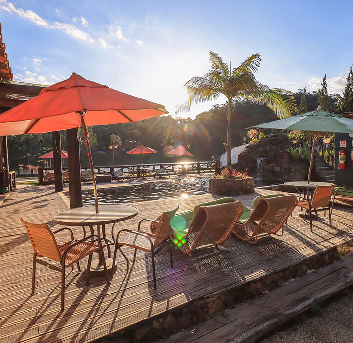 É o lugar perfeito para relaxar, com espreguiçadeiras, mesas, guarda-sóis e um bar, tudo com uma vista incrível da natureza ao redor.
