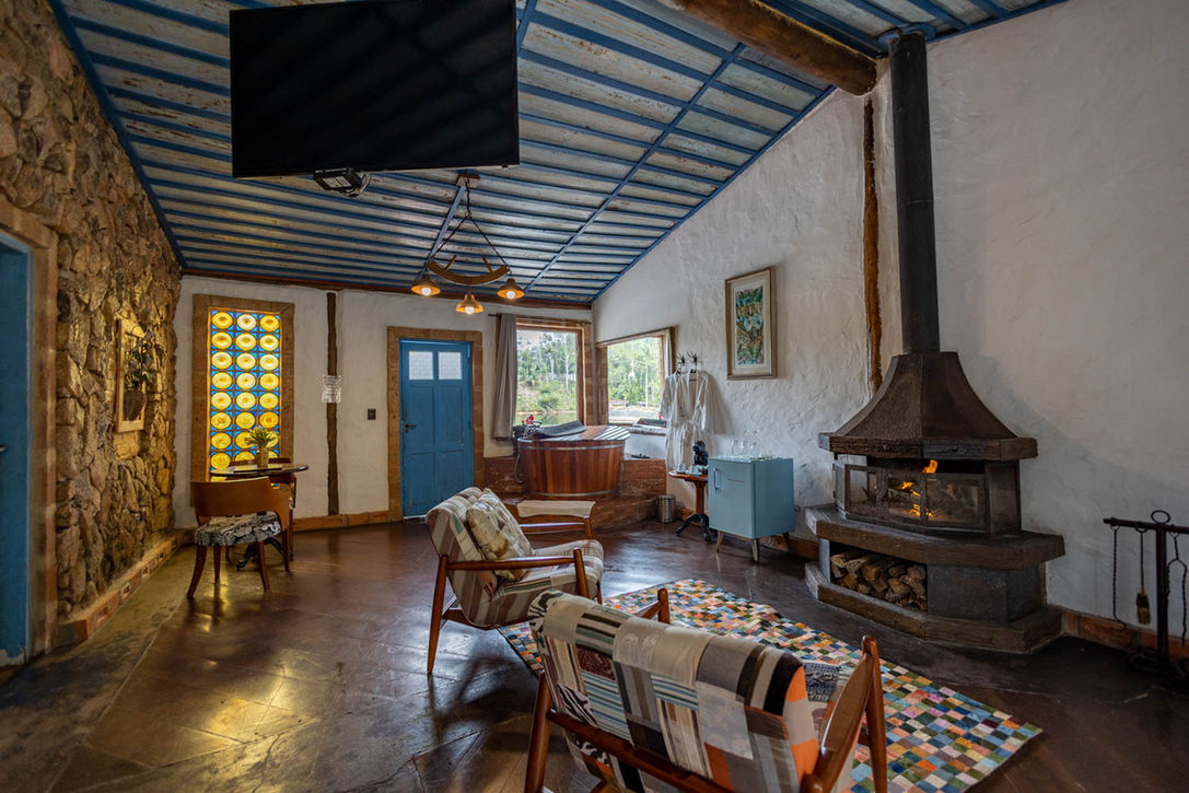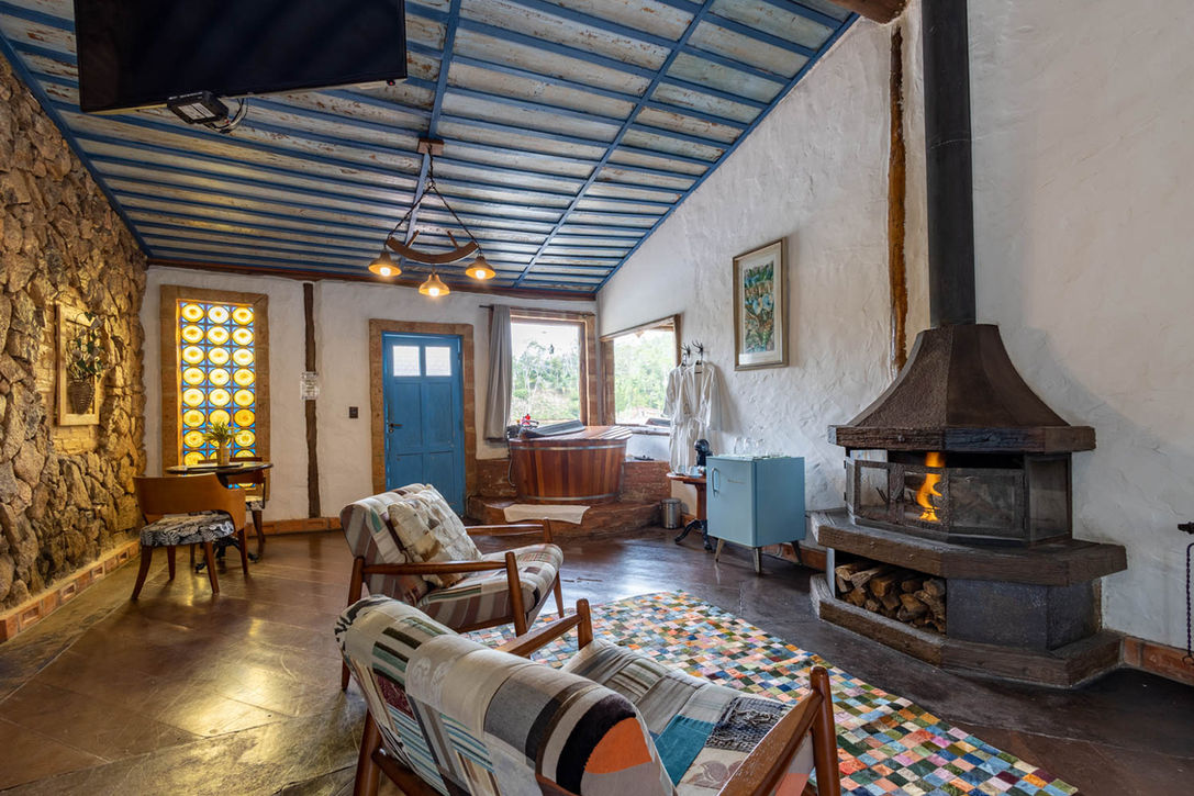 A Suíte Beija-flor oferece um ambiente rústico e sofisticado, climatizado e com lareira e ofurô para o seu conforto.